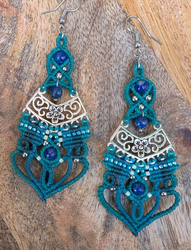 Une cascade de tons bleus pour ces boucles de la collection "Glorieuses" construites à partir d'un joli filigrane acier au motif de fleur avec 3 perles de lapis lazuli. Ces boucles mesurent 9 cm de haut crochet acier inclus, et 3 cm au plus large